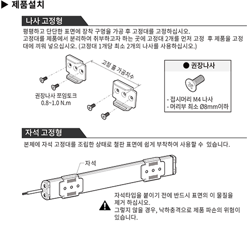- 자석 고정식의 경우 제품 길이 6L이상은 추천하지 않습니다. 제품 낙하로 인한 파손의 위험이 있습니다.